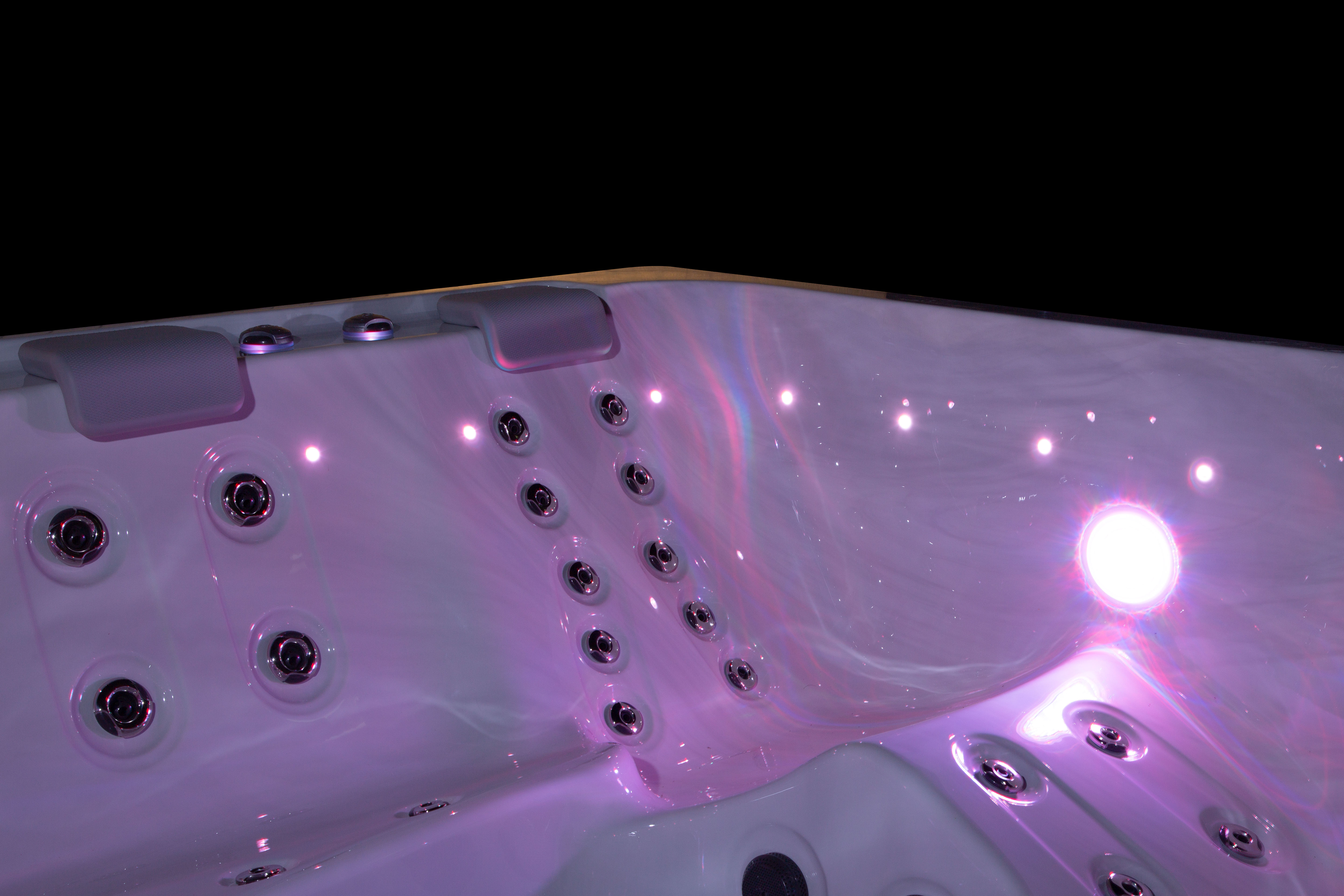Хорошо продуманная система освещения превращает вечерний отдых в эстетическое наслаждение. Многоцветная подводная подсветка Northern Lights, дополненная изящной подсветкой ватерлинии, создает сложную игру света на воде, способствующую глубокой релаксации и визуальной гармонии.