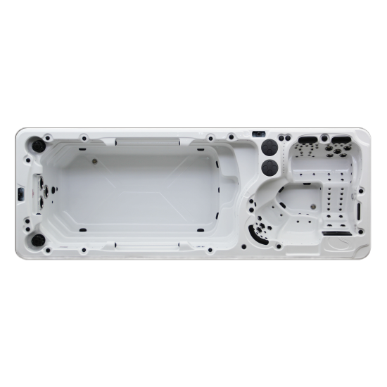 Профессиональный плавательный спа-бассейн с тремя форсунками противотока, на каждую из которых приходится по одному мощному насосу в 3 лс. Силу потока воды и направление любой плавательной форсунки можно настроить индивидуально, что важно как для любителя, так и для профессионального пловца. Дополнительно по обе стороны бассейна расположены по 1 поручню с подсветкой для различных упражнений. В спа-зоне с комфортом разместятся 4 человека, на трех сидячих и одном лежачем месте.